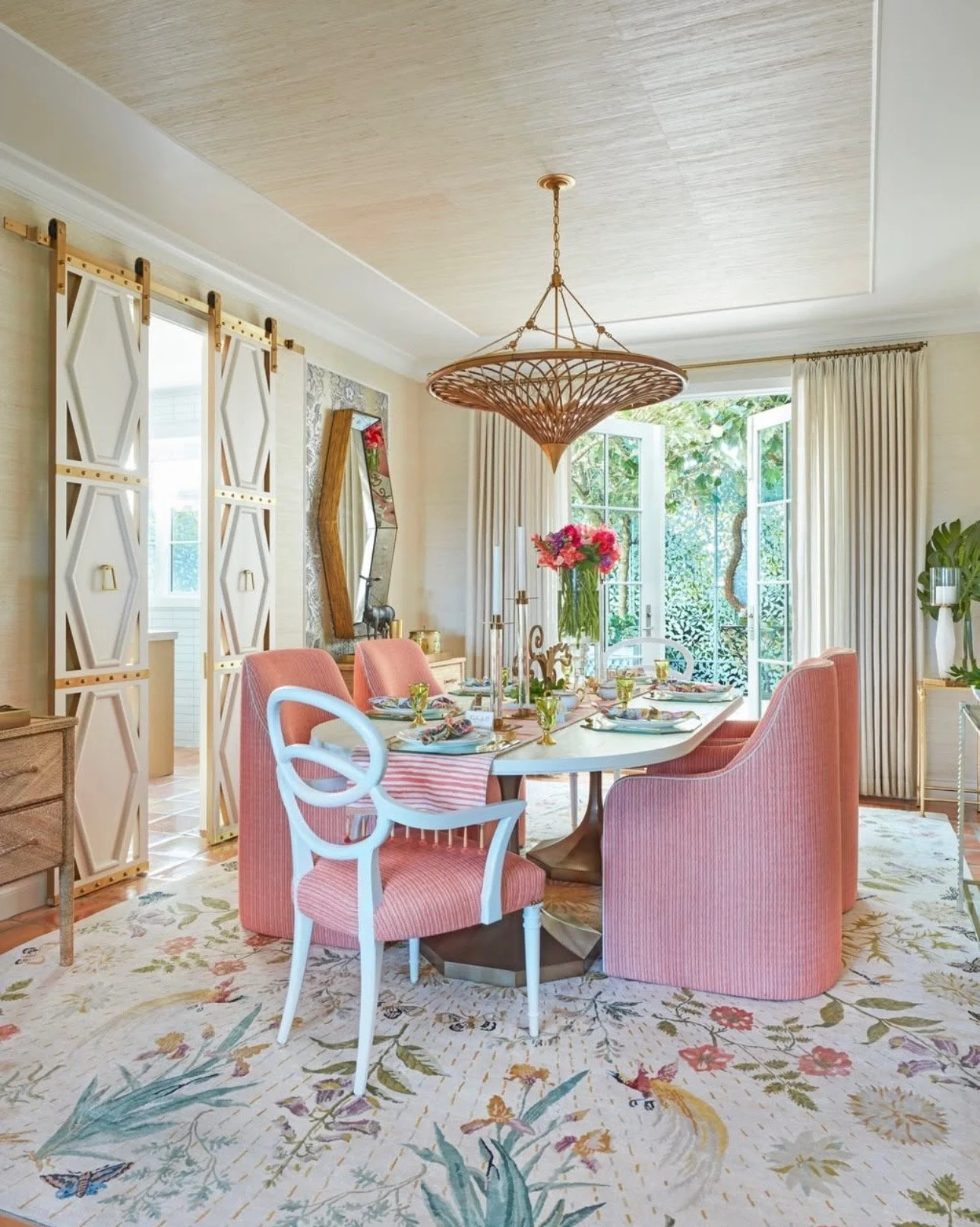 The dining room is anchored by a beautiful custom-woven rug, meticulously hand-knotted to enhance the room's textural richness. At the heart of the space is an octagonal dining table with metallic pedestals and a pearlized oyster-finished top, providing an air of elegance and modernity.